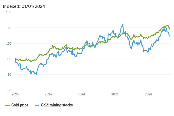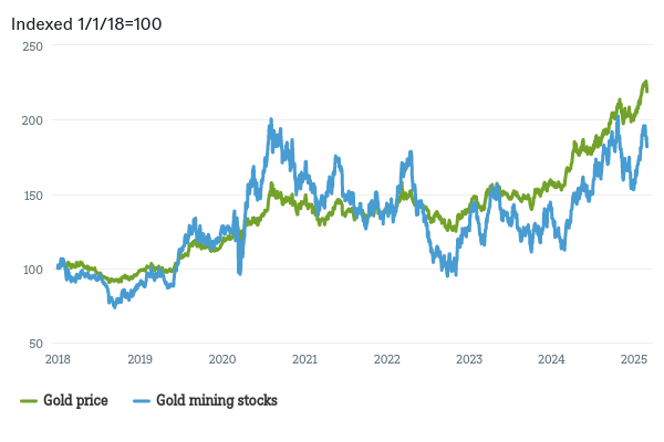 Source: Refinitiv, as of 28/02/2025; The FTSE Gold Mines Index is a stock index that includes the stocks of companies that generate income primarily from gold mining. Past performance is not a reliable indicator of future performance.