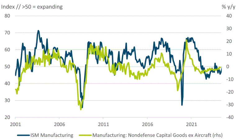 No obstante, esto no implica necesariamente que Estados Unidos esté entrando en recesión. Como muestra nuestro "Chart of the Week", el índice de nuevos pedidos del ISM no es un indicador perfecto de lo que las empresas realmente reportarán como nuevos pedidos en los próximos seis meses. En tiempos normales, el sentimiento puede variar más que la inversión real de un mes a otro, sin reflejar necesariamente tendencias confiables. Esto se debe, en parte, al reducido tamaño de la muestra en dichas encuestas. Más aún, existe una gran diferencia entre expresar una opinión en una encuesta que tomar una decisión real sobre la cancelación de un proyecto planificado, incluso cuando ya se han incurrido en algunos costes.