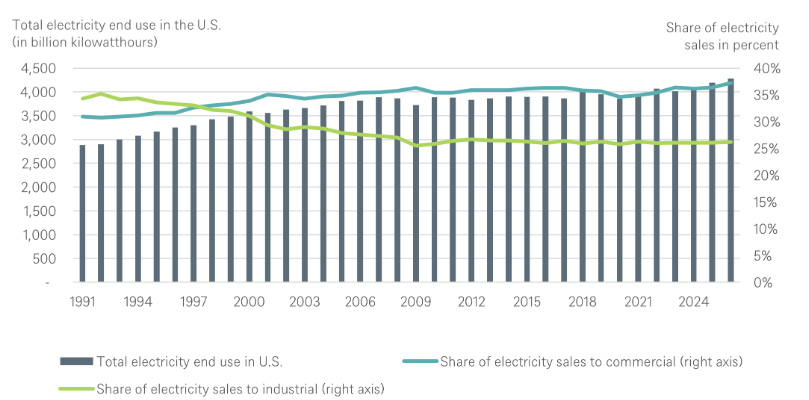 El sector comercial, donde los centros de datos se han convertido en una fuente creciente de demanda, representa actualmente el 37 % del consumo eléctrico final, frente al 31 % en 1991. En contraste, el sector industrial ha reducido su participación del 34 % en 1991 al 26 % en 2024. En términos absolutos, la demanda industrial se ha mantenido estable en torno a los 1.000 billones de kWh desde 1991, mientras que la demanda comercial ha crecido de 855 billones de kWh a 1.434 billones de kWh en 2024.