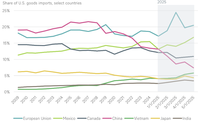 Evaluados bajo este marco, los acuerdos preliminares con Japón, el Reino Unido y la Unión Europea (UE) no resultan tan negativos —al menos para los distintos socios negociadores de Trump y en comparación con los temores iniciales. Una forma sencilla de ilustrar estos puntos es observar cómo ha cambiado con el tiempo la composición de las importaciones estadounidenses según el país de origen. Nuestro gráfico de la semana combina datos anuales con cifras mensuales más volátiles correspondientes a este año, hasta el mes de mayo.