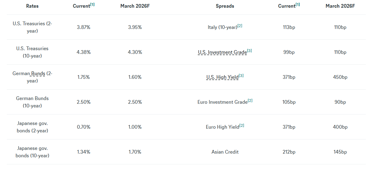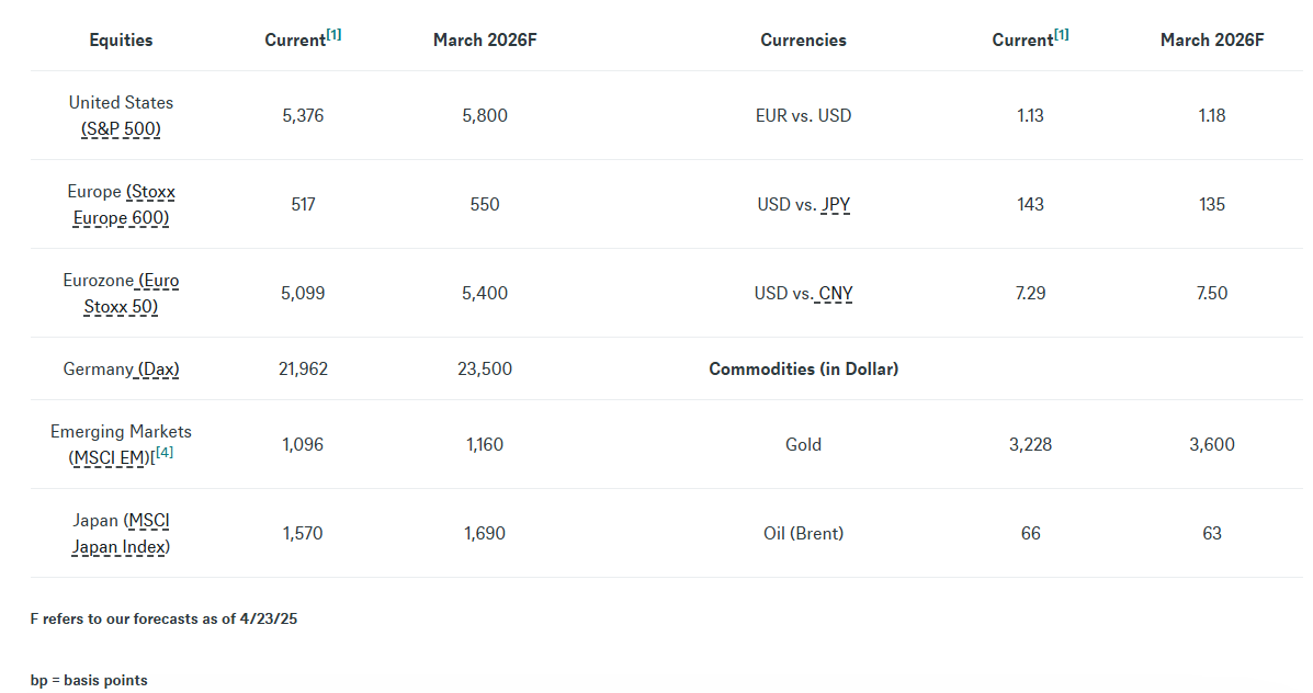 En comparación con nuestras previsiones a 12 meses de marzo, hemos rebajado ligeramente nuestras previsiones de rendimiento de los bonos gubernamentales de EE.UU. y Alemania y, en esencia, ahora no estamos muy lejos de los niveles actuales. El movimiento lateral es el resultado de fuerzas opuestas que afectan los rendimientos: en EE. UU., la desaceleración económica (y los tres recortes de tasas de interés que esperamos), por un lado, y las enormes necesidades de refinanciamiento y la pérdida de confianza en los bonos del Tesoro de EE.UU., por el otro. En Alemania, el paquete de infraestructura de un billón de euros está ayudando a contrarrestar un crecimiento económico más débil de lo esperado. En el frente de la moneda, no vemos ninguna recuperación para el dólar y esperamos que se debilite ligeramente más.