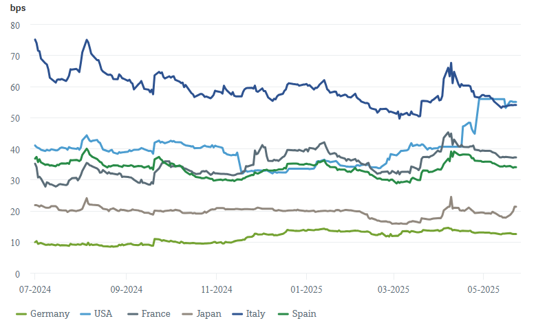 Una mirada a los swaps de incumplimiento crediticio (CD) de países seleccionados muestra que la solvencia crediticia y el riesgo de incumplimiento de Alemania han sido vistos por los inversores como muy estables en el pasado reciente. Por el contrario, la tendencia en los EE. UU. es particularmente negativa, con los CD en los EE.UU. disparándose después de que Donald Trump anunciara sus planes arancelarios y estableciéndose aproximadamente al mismo nivel que Italia desde entonces.