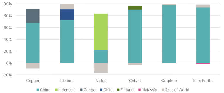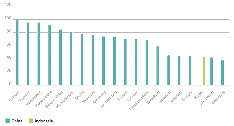 China domina la refinación en 19 de 20 minerales relacionados con la energía (proporción del principal país de refinación)