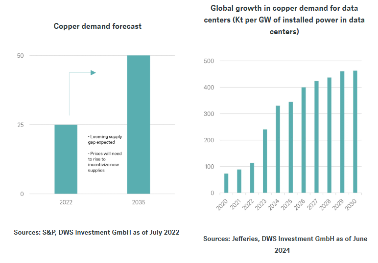 Dado el elevado consumo energético asociado a la IA —especialmente en la operación de centros de datos—, la importancia de los minerales críticos en la generación de energía cobra cada vez mayor relevancia. Esto abarca no solo a las centrales nucleares y las fuentes renovables, sino también a la infraestructura de red, altamente intensiva en metales. Los operadores de centros de datos no solo están firmando acuerdos de compra de energía a largo plazo, sino que también están invirtiendo en sus propias instalaciones de generación renovable.