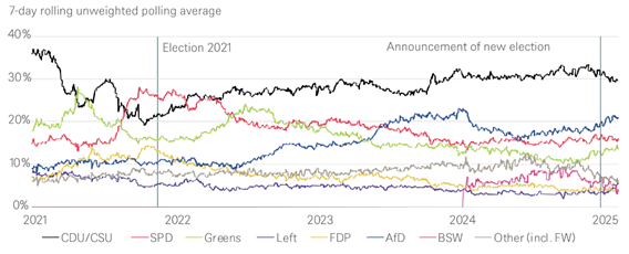 Fuente: Promedios simples elaborados a partir de datos de wahlrecht.de; a 31 de enero de 2025
