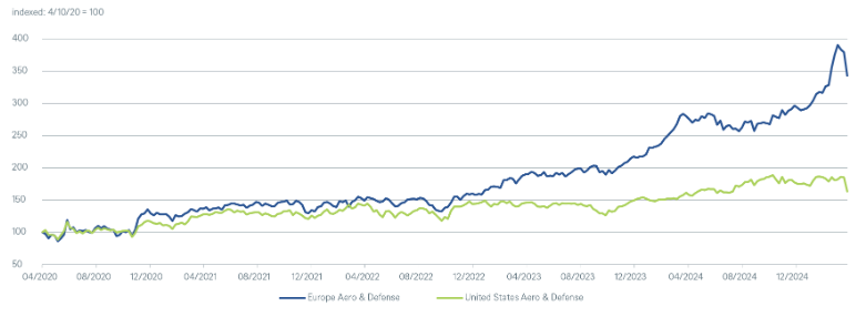 Gráfico 3: La reactivación armamentista europea lleva más de dos años reflejándose de forma intensa en los mercados bursátiles.