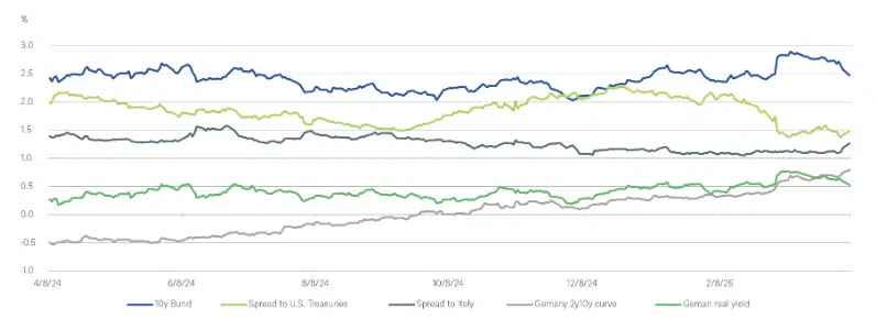 Los bonos del gobierno alemán han reaccionado con bastante cautela al paquete en su conjunto. El impresionante aumento inicial de 30 puntos básicos en los rendimientos casi se redujo a la mitad en el transcurso de tres semanas. Actualmente, los mercados de bonos están dominados más por preocupaciones económicas que por temores inflacionarios. En respuesta al paquete fiscal y al impacto esperado de los posibles aranceles de Trump, hemos reducido nuestra previsión de recortes de tipos de interés por parte del Banco Central Europeo (BCE) de tres a uno hasta marzo de 2026. Queda por ver si esta previsión necesita ser ajustada debido a las políticas arancelarias reales.