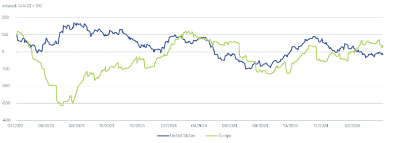 En tercer lugar, estos acontecimientos se produjeron en un momento en que las acciones europeas cotizaban con un descuento récord de aproximadamente el 40 % respecto a sus equivalentes estadounidenses, lo que las posicionaba favorablemente para una recuperación. Al mismo tiempo, los datos económicos de la eurozona han superado de forma sistemática las expectativas de los analistas desde mediados de 2024, mientras que en Estados Unidos las cifras comenzaron a decepcionar a partir de noviembre del año pasado.