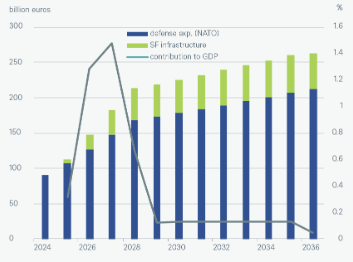 Gráfico 2a - El aumento del gasto en defensa e infraestructuras podría sumar más de un punto porcentual al crecimiento del PIB de aquí a 2027.