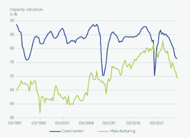 Fuentes: German Ministry of Defense, DWS Investment GmbH; datos a 07/04/25 | Gráfico 2b - El paquete fiscal impacta en capacidades generales infrautilizadas. No obstante, es fundamental analizar los distintos sectores de forma individual en Alemania.