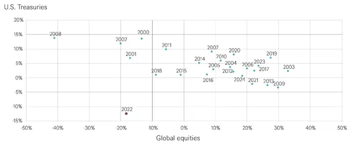 Para lograr rendimientos más estables en las diferentes fases del mercado, creemos que es esencial combinar ambas clases de activos en una cartera. Sin embargo, muchos inversores todavía piensan en 2022, cuando esta diversificación no funcionó: tanto los precios de las acciones como de los bonos cayeron. Sin embargo, en los últimos 25 años, los bonos casi siempre han sido un factor estabilizador para una cartera de acciones/bonos.