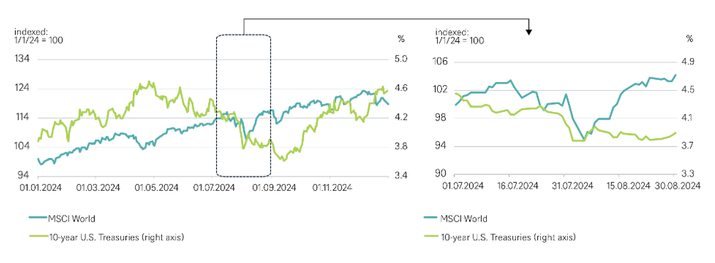 Por lo tanto, en nuestra opinión, los bonos deberían incluirse como elemento estabilizador en la construcción de la cartera. Especialmente porque la interacción habitual entre acciones y bonos está volviendo a un nivel algo normal a medida que caen las tasas de inflación y se flexibiliza la política monetaria. Esto fue particularmente evidente a mediados del año pasado. Si bien los índices de acciones registraron pérdidas significativas en agosto, los bonos gubernamentales se beneficiaron de la caída de los rendimientos (ver gráfico). En una situación de mercado impulsada principalmente por preocupaciones de crecimiento, una cartera mixta puede beneficiarse de los efectos de diversificación.