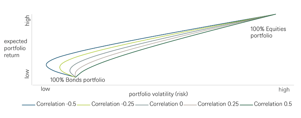 Diversificar, ya sea dentro de una clase de activos o entre varias, mejora el perfil de riesgo de la cartera resultante.En resumen, cuando combinas acciones y bonos, el riesgo de la cartera conjunta es menor que el promedio de los dos componentes. El efecto positivo de la diversificación, que permite alcanzar la misma rentabilidad esperada con un menor riesgo, se ilustra claramente en el siguiente gráfico. La El gráfico muestra cómo la frontera eficiente se desplaza hacia la izquierda con menores correlaciones, mejorando así el perfil riesgo-rentabilidad de la cartera resultante.