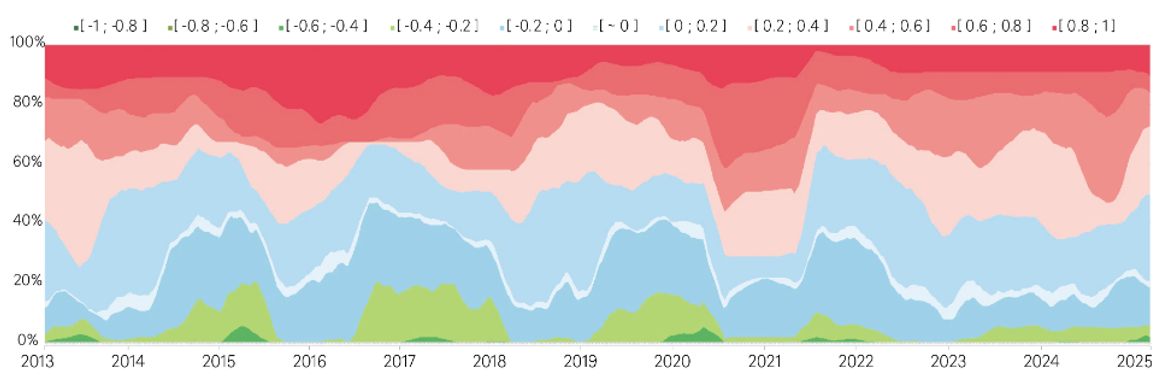 Distribución de diferentes rangos de correlación en la matriz de correlación total a lo largo del tiempo.