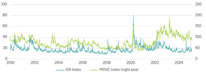 Históricamente, los bonos han sido una clase de activos menos volátil durante muchos períodos, e incluirlos en una cartera parece razonable, si no necesario, según el perfil de riesgo general. Sin embargo, si observa la volatilidad implícita actual de estas clases de activos, puede ver que, si bien el precio del riesgo en las acciones ha bajado significativamente, la incertidumbre en el mercado de bonos permanece por encima del promedio histórico de la última década (ver gráfico). Esto se debe en parte a las incertidumbres actuales sobre el crecimiento, la inflación y la política monetaria, pero también al deterioro de los ratios de deuda pública con saldos fiscales negativos. Los inversores en renta variable parecen estar menos preocupados por los riesgos resultantes que los inversores en bonos.