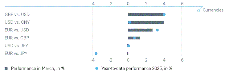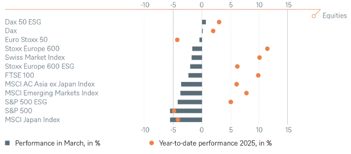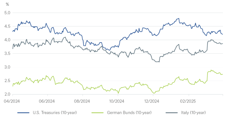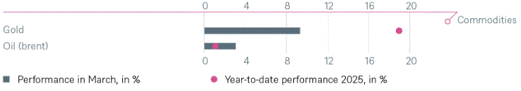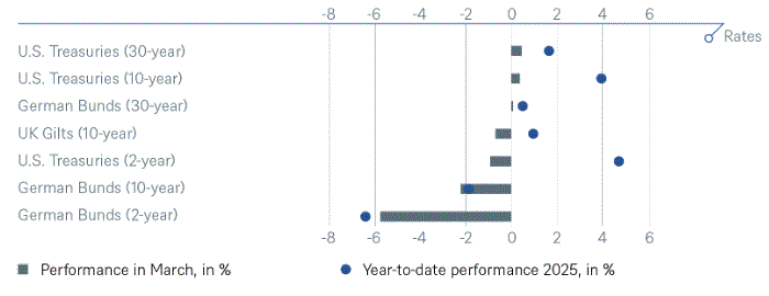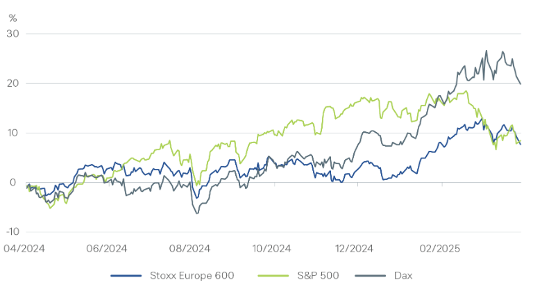 La apuesta más segura en el primer trimestre fue el oro, cuyo precio subió un 19%, el mayor incremento trimestral desde 1986. Sin embargo, esto también se vio favorecido por un dólar débil, frente al cual el euro, por ejemplo, subió un 4,5%. Una vez más, Bitcoin demostró ser un refugio inseguro en tiempos de incertidumbre, con una caída del 12% en el trimestre. La huida hacia inversiones supuestamente menos riesgosas en el mercado estadounidense también se reflejó en el sólido desempeño de los Bonos del Tesoro estadounidense a 10 años, que arrojaron un rendimiento total del 4,0% en el primer trimestre. Al otro lado del Atlántico, los bonos del Gobierno alemán a 10 años perdieron más del 2%. Parte de esto se debe a la ampliación del rendimiento de 30 puntos básicos (pb), el movimiento diario más alto desde la reunificación de Alemania, inmediatamente después del anuncio del paquete de gastos Merz. Sin embargo, al final del trimestre, se habían retrocedido 20 puntos básicos de este fuerte movimiento. El Dax también perdió alrededor de un 5% desde su máximo a principios de marzo. No está claro si esto se debió a la disputa arancelaria o a la creciente comprensión de que podrían pasar varios trimestres o años antes de que los nuevos fondos gubernamentales se reflejen en las ganancias de las empresas que cotizan en bolsa.