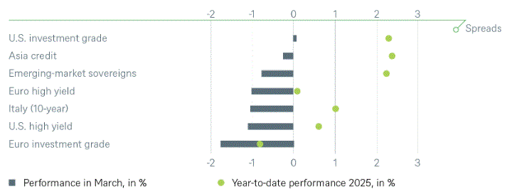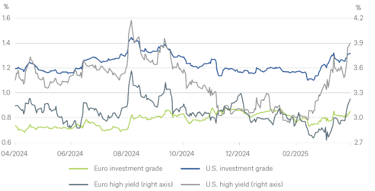 En nuestra opinión, el panorama general para la renta fija a 12 meses sigue siendo positivo: crecimiento decente y suficiente para evitar mayores incumplimientos de los bonos corporativos, es probable que la Reserva Federal (Fed) recorte aún más las tasas de interés y aún no haya escasez de demanda. Pero a corto plazo, los inversores se enfrentan a un entorno más complejo. Por un lado, la inflación a ambos lados del Atlántico sigue luchando por caer al 2% , como desean los bancos centrales, y, en lugar de eso, sufre el riesgo alcista que plantean las políticas arancelarias de Trump, especialmente en EE.UU. Alemania también podría experimentar cierta presión alcista por el paquete de gastos de 1 billón de euros anunciado por el gobierno (que pronto será). Pero hasta ahora los inversores en bonos parecen relajados, tal vez creyendo que pasará un tiempo antes de que los aranceles y el gasto afecten a la economía real. Al mismo tiempo, los mercados de bonos enfrentan preocupaciones de crecimiento, especialmente en EE.UU., donde cada vez más corredores están reduciendo sus perspectivas de crecimiento para 2025. Dividir los 60 pb (tasa real implícita de 50 pb, expectativas de inflación de 10 pb) que los rendimientos del Tesoro a 10 años han perdido desde su máximo del 4,8% a mediados de enero muestra que esta caída proviene casi en su totalidad de pronósticos de crecimiento económico reducidos.