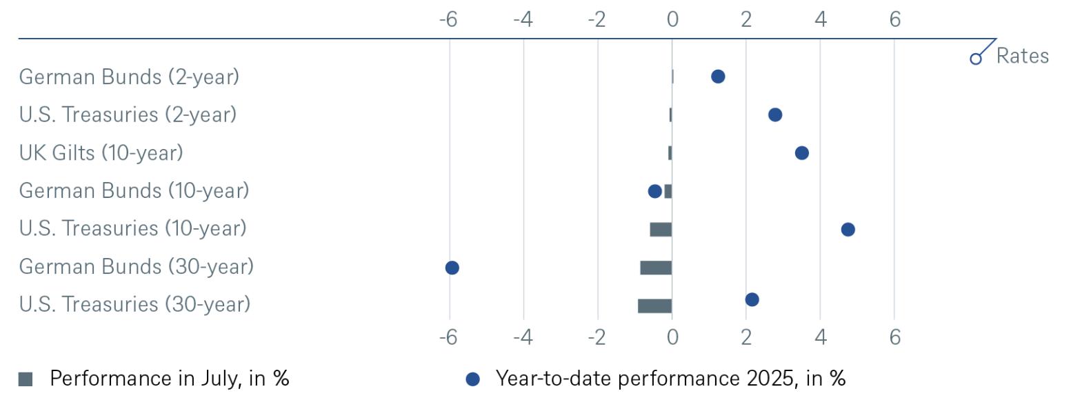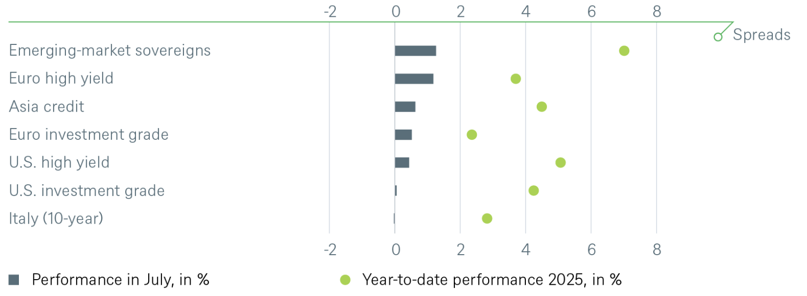 Los mercados de renta fija siguen siendo un foco de atención prioritario para los inversores. Como principales destinos de capital a nivel global, su reacción ante cada nuevo acontecimiento —y no han sido pocos— continúa siendo objeto de estrecha observación. El mes pasado compartimos una nueva perspectiva bajista sobre los bonos soberanos japoneses a dos años. Fundamentamos esta visión en tres factores: un aumento de la oferta en el tramo corto de la curva, una dinámica inflacionaria sólida en Japón (una afirmación que puede sonar inusual para algunos de nuestros lectores más experimentados), y nuestra previsión de que el Banco de Japón podría podría aplicar dos subidas de tipos en el próximo ejercicio. Esta visión se desarrolló favorablemente durante julio, hasta que una demanda inesperadamente fuerte en las subastas de fin de mes interrumpió la tendencia. No obstante, mantenemos intacta nuestra tesis de fondo.
