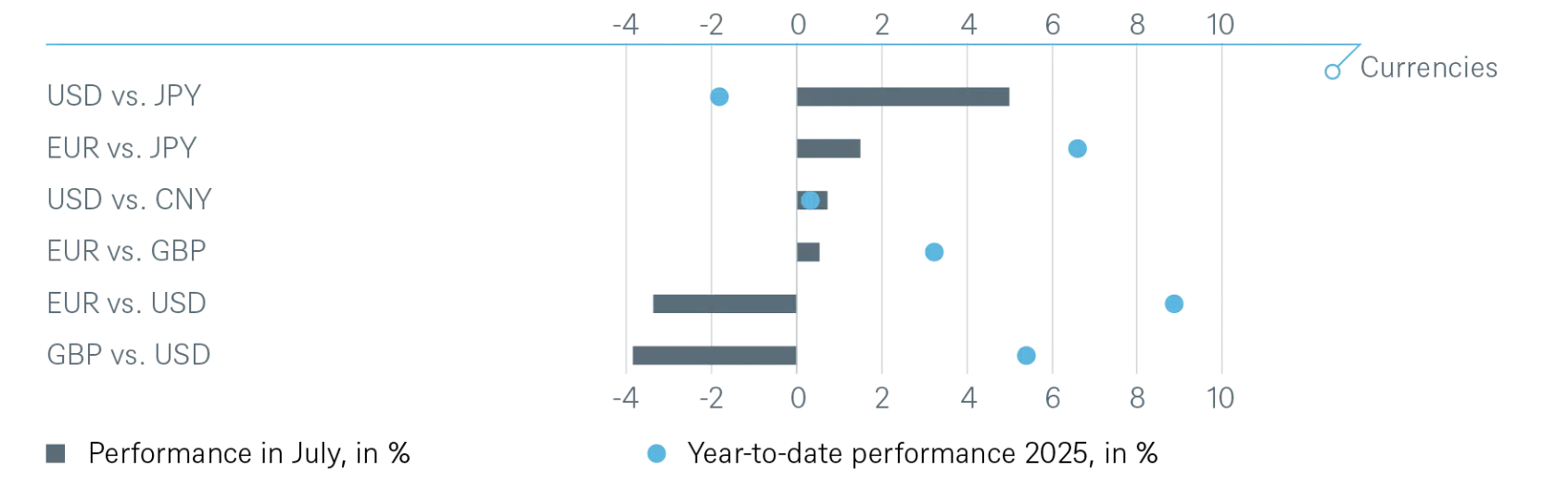Reconocemos esta fase de debilidad y consideramos que podría prolongarse. Dicho esto, en julio el dólar mostró fortaleza, marcando al menos una pausa en la tendencia bajista del año. No creemos que esto represente el inicio de una fase de depreciación significativa al estilo del “Acuerdo Plaza”. El dólar sigue dominando los flujos globales de comercio y divisas, así como las reservas internacionales. Actualmente, no existe ninguna otra moneda que pueda sustituirlo como referencia global.