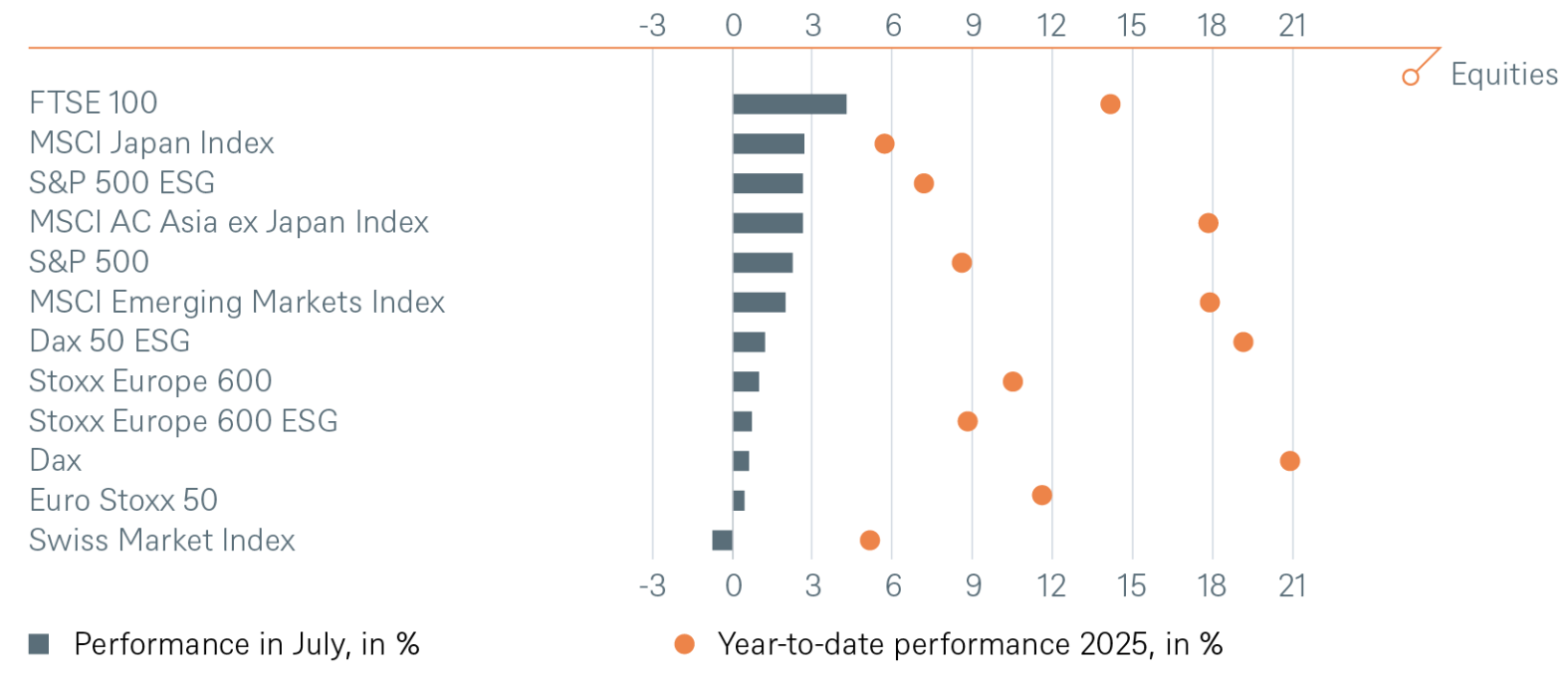 Un avance desigual en los tres grandes temas que siguen preocupando a los inversores. ¿Hubo algún aspecto positivo en julio? Podemos señalar dos elementos que, si bien no resultan deslumbrantes, sí pueden considerarse relativamente alentadores. El primero es que los mercados globales de renta variable no han experimentado una corrección abrupta desde el repunte posterior al Día de la Liberación. En otras palabras, aunque existen numerosos motivos de preocupación, los mercados bursátiles, al menos por ahora, parecen estar descontando estos riesgos. La duración de esta estabilidad sigue siendo una incógnita (véase la sección sobre renta variable más abajo).