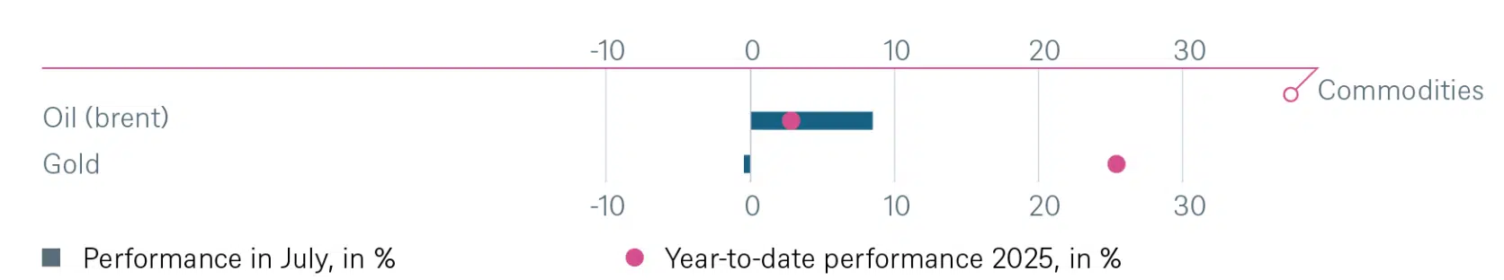 Como hemos señalado en diversas ocasiones, las primas de riesgo se encuentran ajustadas y los mercados están valorados bajo supuestos de perfección. En cuanto al mercado de divisas, observamos la fortaleza del dólar durante julio, aunque prevemos una depreciación moderada frente al euro y la libra esterlina en los próximos 12 meses. No obstante, no compartimos la visión de un debilitamiento estructural del dólar ni consideramos que estemos entrando en un nuevo ciclo de depreciación prolongada. El dólar sigue siendo, por ahora, la moneda de referencia global.