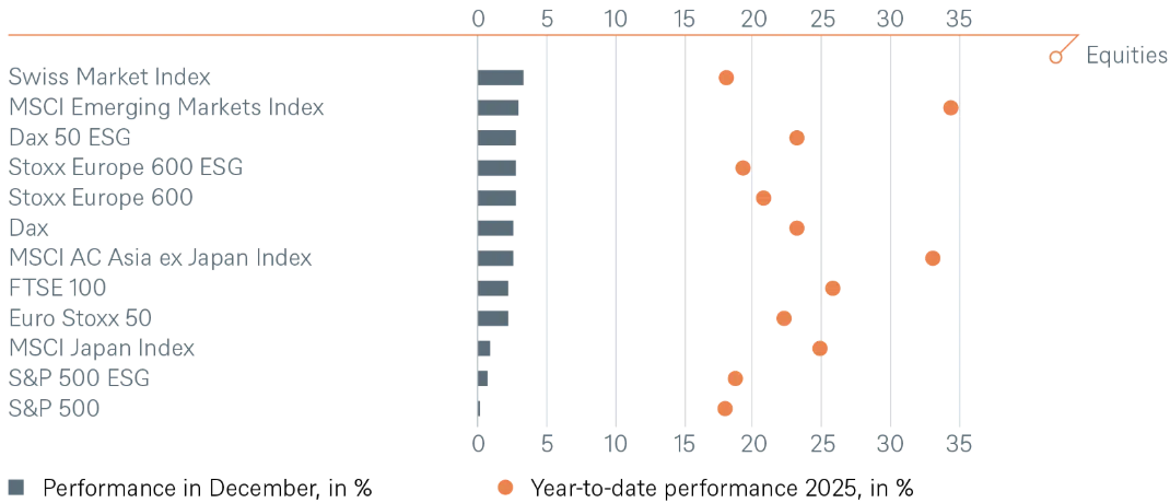 Los mercados emergentes también brillaron en 2025: el índice MSCI Emerging Markets avanzó más del 34%, su mejor desempeño anual desde 2017. Se beneficiaron de una mejora en el sentimiento global de riesgo, la relajación monetaria en EE. UU. y la continua demanda de materias primas y bienes tecnológicos. En China, el crecimiento se mantuvo por debajo de las expectativas a largo plazo; sin embargo, las medidas gubernamentales para impulsar la tecnología y el consumo sostuvieron los mercados. Las bolsas chinas se estabilizaron a lo largo del año pese a retos estructurales como la crisis inmobiliaria y las tensiones geopolíticas, que probablemente seguirán ejerciendo presión.