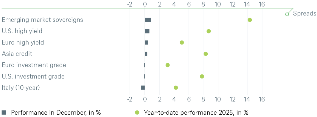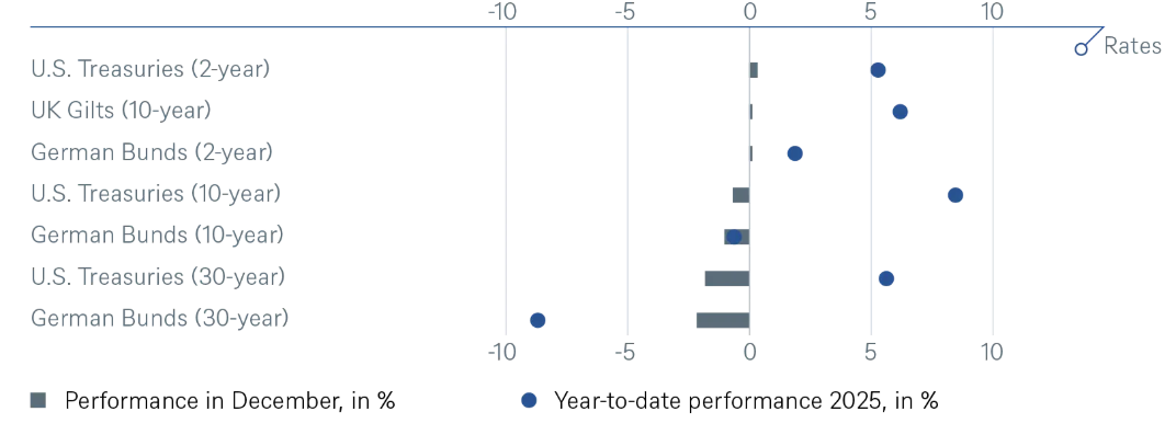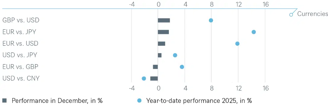 En retrospectiva, resulta llamativo lo robustos que fueron los mercados en 2025 pese a las numerosas turbulencias políticas. El DAX alemán, el Topix japonés y los ‘Magníficos 7’ en EE. UU. registraron cada uno ganancias superiores al 20%. Mientras tanto, el S&P 500 prolongó su sólido desempeño de 2024, avanzando un 18%. Así, la vieja máxima bursátil de que los mercados políticos tienen ‘piernas cortas’ volvió a quedar refutada. El ‘Día de la Liberación’, a comienzos de abril, provocó inicialmente un fuerte desplome cuando el gobierno estadounidense cuestionó la cooperación internacional imponiendo aranceles drásticos. Sin embargo, el rápido giro en Washington tranquilizó a los mercados, que luego asumieron otras incertidumbres políticas con sorprendente calma. El tono positivo se reforzó gracias a los ambiciosos planes de inversión de grandes corporaciones estadounidenses para ampliar la infraestructura de IA. No obstante, la desilusión llegó en el cuarto trimestre: no todas las colaboraciones fueron celebradas y, incluso entre los rentables ‘Magníficos 7’, apareció por primera vez el término ‘dificultades de financiación’. Algunas acciones de IA cerraron el año en negativo, un proceso de maduración que impulsó una selección más rigurosa de valores. Los bonos del Tesoro estadounidense a diez años se situaron entre los ganadores del mercado de renta fija en 2025, con una rentabilidad total del 6,2%, el mejor resultado desde 2020. Por el contrario, el dólar perdió poder adquisitivo frente a todas las divisas del G10, lo que llevó al índice dólar a caer más de un 9%, su peor año desde 2017.