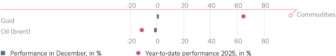 El desarrollo de las materias primas fue mixto. El oro subió más de un 65 % y la plata más del 145 %, impulsados por los riesgos geopolíticos y el aumento de las compras por parte de los bancos centrales que diversificaban sus reservas tras la congelación de las reservas en dólares de Rusia. Los inversores privados e institucionales siguieron la tendencia en medio de una alta deuda y déficit gubernamentales. El petróleo, por otro lado, cayó alrededor de un 20 % a pesar de numerosos conflictos en Oriente Medio y sanciones más estrictas contra Rusia, no menos importante debido a la sorprendentemente generosa política de producción de la OPEP.