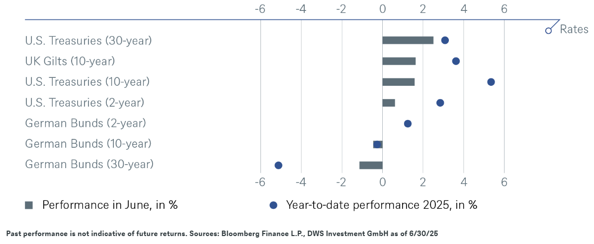 Junio, con el bombardeo de Irán por parte de Israel y Estados Unidos, puso un cierre inquietante a un segundo trimestre ya de por sí turbulento. El trimestre comenzó con la quinta mayor caída en dos días (más del 10 %) del S&P 500 desde la Segunda Guerra Mundial. El detonante fue el paquete arancelario de Trump, que incluía una tasa base del 10 %, a la que se sumaban aranceles individuales de dos dígitos medios (20 % para la UE, 24 % para Japón y más del 35 % para China). La tormenta en los mercados, el temor a una recesión en EE. UU. y la rebaja de la calificación crediticia del país por parte de Moody’s empujaron los rendimientos de los bonos del Tesoro a 30 años por encima del 5 %. Trump cedió y anunció una moratoria de 90 días sobre los aranceles individuales para muchos países. Posteriormente, al extender la moratoria a China, los mercados iniciaron una fuerte recuperación. Incluso la guerra con Irán solo provocó un breve repunte en los precios del petróleo y cierta tensión, hasta que un alto el fuego devolvió la calma. A lo largo del trimestre, los datos económicos globales se mantuvieron en general estables, lo que respaldó a los mercados.