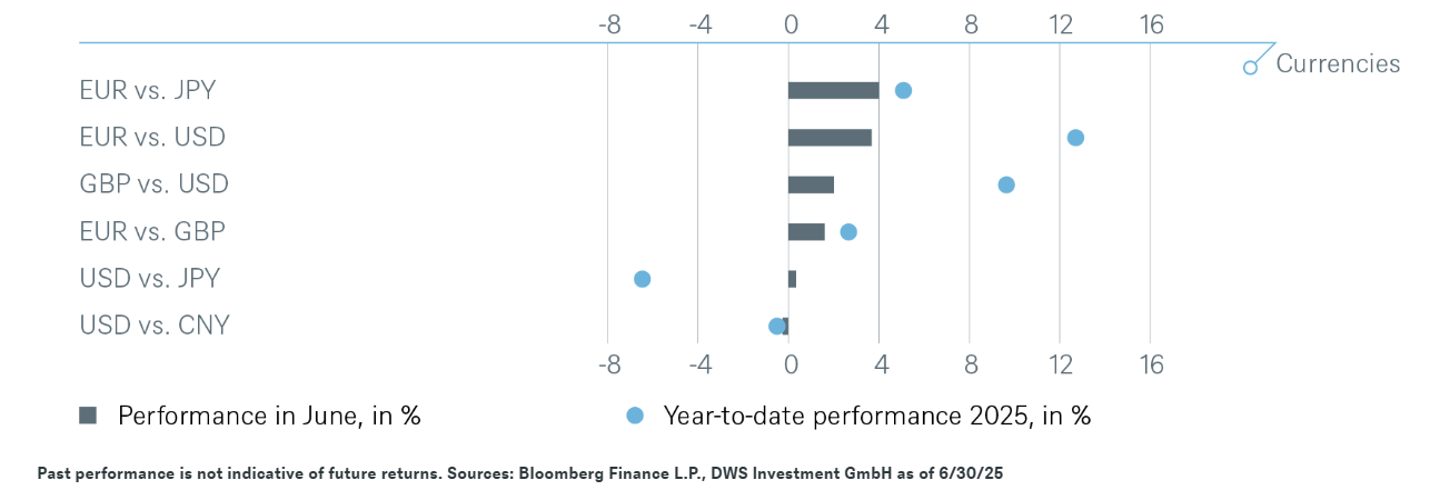 El dólar también desempeña un papel importante en el comportamiento de las distintas clases de activos. Aunque el S&P 500 subió alrededor de un 10 % en el segundo trimestre, desde la perspectiva de un inversor que calcula en euros, ese rendimiento se reduce prácticamente a cero. Los movimientos en los tipos de cambio también se reflejarán en los informes trimestrales que comienzan a publicarse. Estos favorecen a las empresas estadounidenses, ya que los ingresos en el extranjero se convierten a más dólares, y perjudican a las compañías de países cuyas monedas se están apreciando. Este factor probablemente haya sido una de las razones del repunte de las acciones estadounidenses en el segundo trimestre, compensando su fuerte infrarendimiento frente a la renta variable global en el primer trimestre. Esto fue especialmente evidente en junio, cuando el Nasdaq-100 registró una rentabilidad total del 6,3 %, mientras que el Euro Stoxx 50 cayó un 1,2 %.