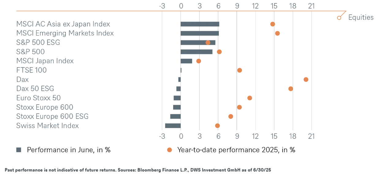 Presentamos nuestra perspectiva a 12 meses vista con más detalle en la edición anterior de los Investment Traffic Lights. Mantenemos nuestra visión constructiva en el escenario base actual, aunque los rendimientos objetivo se han reducido ligeramente tras el sólido comportamiento del mercado en las últimas semanas. Siempre que no haya nuevas sorpresas negativas, creemos que se podría argumentar que el impulso positivo del mercado podría continuar. Dicho esto, las primas de riesgo tanto en los mercados de renta variable como en los de bonos corporativos se han reducido tanto que incluso pequeñas decepciones podrían bastar para provocar otra corrección. A continuación, nos centramos en las clases de activos cuya evaluación a corto plazo cambió en junio. Como se mencionó, estamos redactando este texto antes del 4 de julio, fecha en la que Trump espera aprobar su “Big Beautiful Bill”. Cualquier retraso en ella, o nuevas alarmas arancelarias en los días previos al fin de la moratoria el 9 de julio, podrían provocar una nueva oleada de volatilidad en los mercados.