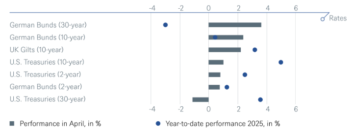 Los episodios de tensiones arancelarias han sometido a prueba a los bonos soberanos globales. En EE. UU., los rendimientos se debaten entre subir, debido al mayor riesgo y a una prima por plazo más elevada, o bajar, debido a una perspectiva de menor crecimiento. Prevemos movimientos laterales y volátiles en los próximos meses.