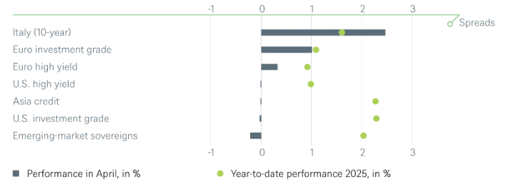 Eurozona: Según nuestros supuestos macroeconómicos, seguimos siendo positivos en el crédito con grado de inversión (IG) en euros. La entrada neta continua en la clase de activos es un fuerte respaldo técnico. Somos más cautelosos con respecto a HY, ya que los diferenciales se ajustaron nuevamente en la segunda quincena de abril y reflejan el entorno de riesgo actual.