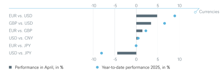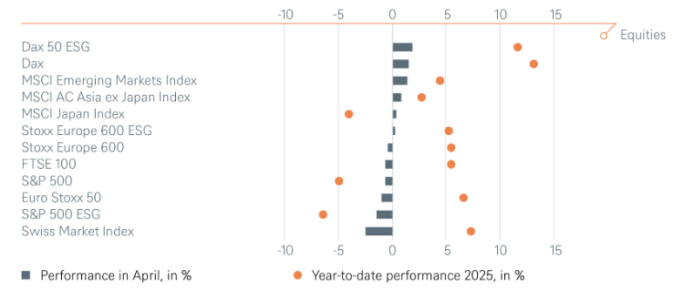 En gran medida, los mercados reaccionaron negativamente en abril debido al resurgimiento de tensiones comerciales. Trump elevó los aranceles globales en más del 10% para todos lo productos de todos los países (excepto Rusia y Corea del Norte, entre algunas excepciones), así como aranceles "recíprocos" adicionales que oscilaban predominantemente entre el 15% y el 45% para 180 países. En un intercambio de golpe por golpe con China, los aranceles aumentaron posteriormente hasta un 145% para las importaciones de ese país. Pero la posterior crisis de los mercados de acciones, bonos y divisas parece haber sido demasiado para EE.UU. y en abril se vio muchos retrocesos, de los cuales una pausa de 90 días en la aplicación de aranceles recíprocos fue la parte más importante. Los mercados también reaccionaron al retroceso de Trump en los aranceles y a sus declaraciones sobre Jerome Powell.