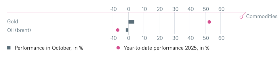 Quien se limite a observar los cambios mensuales en los precios del oro (+4%) y del petróleo (–3%) podría concluir erróneamente que octubre fue un mes sin sobresaltos geopolíticos. Sin embargo, la volatilidad intrames muestra otra realidad: el oro llegó a subir un 13% desde comienzos de mes, rozando los 4.400 USD por onza, antes de retroceder por debajo de los 4.000 USD y estabilizarse en ese nivel. El crudo Brent, por su parte, siguió la dirección opuesta: cayó de 68 USD a cerca de 60 USD por barril, para luego recuperarse hasta 65 USD. Mientras tanto, los mercados bursátiles globales alcanzaron nuevos máximos históricos, interrumpidos únicamente por un retroceso breve pero pronunciado.