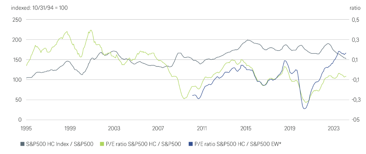 Como muestra el gráfico, el sector sanitario estadounidense ha tenido un comportamiento similar al del S&P 500. La discrepancia observada en los últimos 18 meses se debe principalmente a la fortaleza de los grandes valores tecnológicos estadounidenses. El panorama es similar en cuanto a las valoraciones. El sector cotiza con un ligero descuento respecto al mercado general y por debajo de su valoración relativa histórica. Sin embargo, cotiza con una ligera prima respecto al mercado de igual peso, lo cual, en nuestra opinión, está justificado.