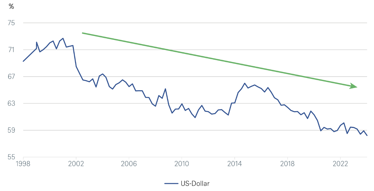 Se está produciendo una diversificación que se aleja del dólar. Sin embargo, el dominio de la moneda estadounidense parece aún firmemente arraigado. No es solo en el ámbito financiero donde el dólar ofrece diversos beneficios, como liquidez y seguridad jurídica en lo que respecta a las transacciones financieras. La victoria electoral de Donald Trump probablemente también afiance aún más el liderazgo internacional de la moneda estadounidense. Probablemente pasarán décadas antes de que el dominio del dólar comience a desmoronarse de manera notable.