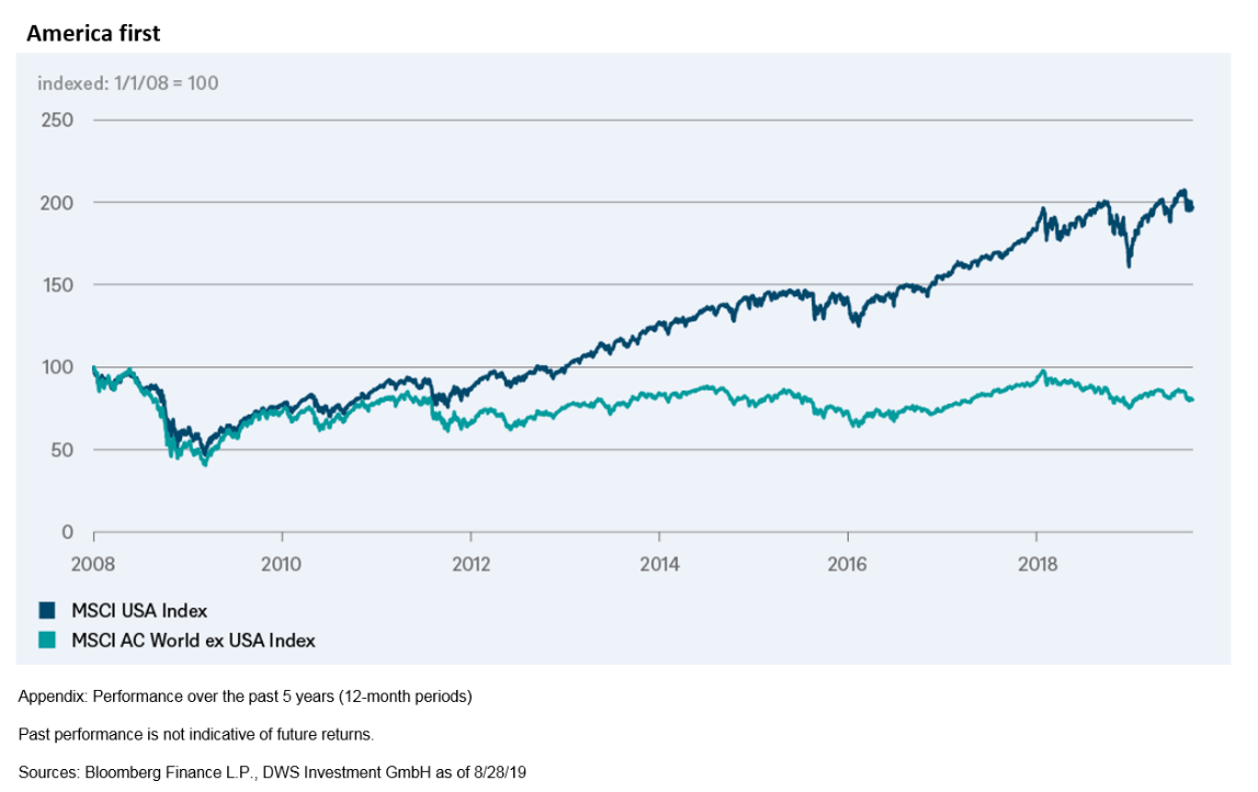 Tuttavia, c'è una differenza notevole, come mostra il nostro "Grafico della settimana". Rispetto all'inizio del 2008, vale a dire prima della grande crisi, i titoli azionari americani hanno compensato tutte le perdite, dopo un calo di oltre il 50%, e da allora il loro valore è raddoppiato. Al contrario, le azioni non statunitensi sono ancora scambiate al di sotto del livello di gennaio 2008 (calcolo in dollari statunitensi). Thomas Bucher, Equity Strategist di DWS, spiega questa discrepanza attribuendole alla maggiore crescita degli utili delle società statunitensi. Ha aiutato il mercato U.S anche la composizione per settore: all'interno degli indici statunitensi, il settore dei servizi e soprattutto le aziende fortemente focalizzate sulla tecnologia digitale sono rappresentate in misura maggiore rispetto, ad esempio, agli indici europei.
