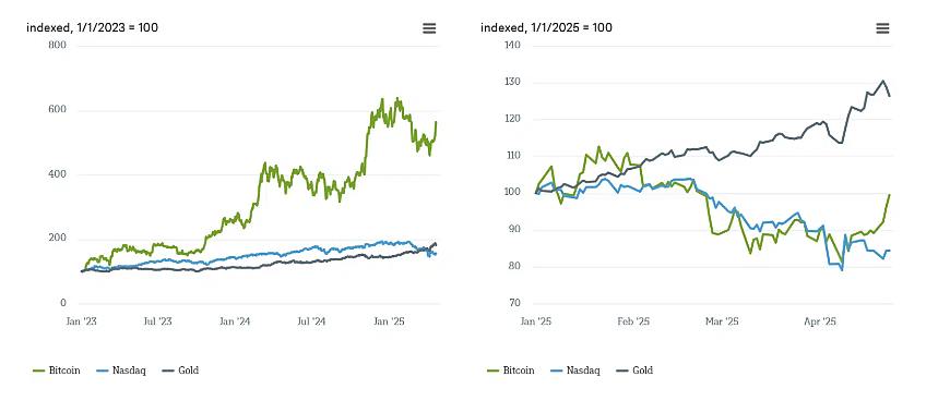 Nei periodi di forte incertezza, non sorprende che l’oro – tradizionalmente considerato il bene rifugio per eccellenza – abbia mostrato la sua forza: nel 2025 ha sovraperformato sia Bitcoin che il Nasdaq con un ampio margine. Sembra quindi che, nei momenti più turbolenti, gli investitori preoccupati continuino a preferire il “vecchio” oro fisico rispetto al “nuovo” oro digitale rappresentato da Bitcoin.