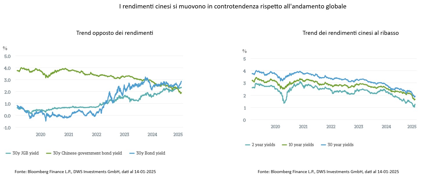 Sul segmento a lungo termine, il movimento è stato particolarmente sorprendente. A Novembre dello scorso anno, il rendimento dei titoli di Stato cinesi a 30 anni è sceso al di sotto di quello dei corrispettivi giapponesi. Questo calo dei rendimenti cinesi li porta al di sotto di quelli di un Paese che per lungo tempo è stato il riferimento per deflazione e stagnazione economica. Il timore è che la Cina possa avviarsi verso una forma di "giapponesizzazione" – un ripetersi del lungo periodo di crescita debole e deflazione che il Giappone ha subito e dal quale solo ora sembra emergere.
