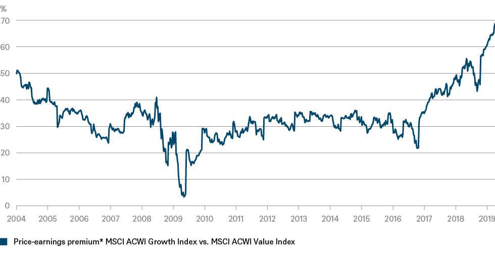 Soprattutto nelle loro valutazioni relative, che, in particolare, testimoniano le attuali basse aspettative sul valore dei titoli. Come mostra la nostra "Chart of the Week", il MSCI ACWI Growth and Value Index è a livelli record. Misurata in base al rapporto P/E, la crescita costa il 70% in più del valore. "Da qualche tempo osserviamo che le azioni più costose stanno diventando sempre più costose, mentre quelle più economiche lo sono ancora di più", afferma Thomas Schuessler, Co-Head of Equities di DWS.