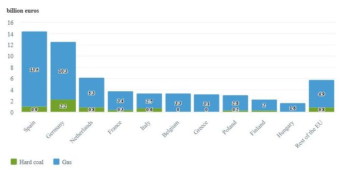 Supponendo un'efficienza del 50% per l'impianto a gas e del 40% per quello a carbone. Utilizza il prezzo del gas Title Transfer Facility (TTF) quando non è disponibile uno scambio Paese e API 2 per il carbone.
