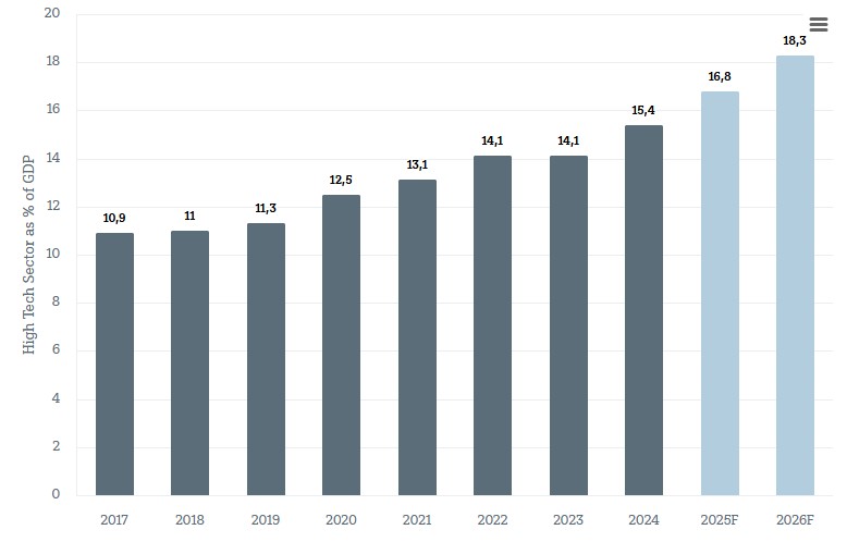 Il Partito Comunista Cinese ha recentemente tenuto il suo 15° plenum, concentrandosi sul prossimo Piano Quinquennale (2026–2030). Le notizie provenienti da fonti interne e dai relativi incontri politici suggeriscono una direzione chiara: il futuro sarà probabilmente ad alta tecnologia. Come mostra il nostro Grafico della Settimana, la quota del settore high-tech sulla domanda finale totale, espressa in percentuale del prodotto interno lordo (PIL), è cresciuta costantemente e dovrebbe raggiungere il 18,3% nel 2026 – quasi il doppio rispetto a dieci anni fa.