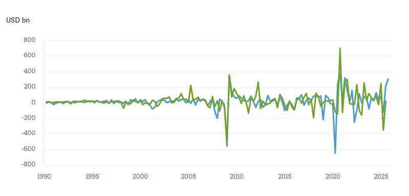 Il nostro Grafico della Settimana mette in evidenza le variazioni annuali di due indicatori chiave degli utili negli Stati Uniti. Il primo riguarda gli utili operativi delle società dell’S&P 500. Il secondo fa riferimento ai profitti societari complessivi, come riportati nei dati macroeconomici nazionali after tax ed escludendo le rettifiche di valutazione e di ammortamento. Per decenni entrambe le serie si sono mosse in modo pressoché sincronizzato, riflettendo il forte legame tra mercato azionario ed economia reale. Dalla pandemia, tuttavia, questa correlazione sembra essersi incrinata. Gli utili operativi delle società dell’S&P 500 mostrano da circa un anno oscillazioni più ampie e un andamento dinamico, mentre i profitti economici complessivi risultano in ritardo.