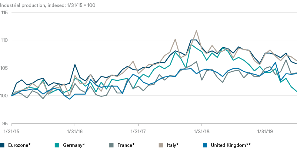 La settimana scorsa abbiamo descritto come lo stato d'animo delle imprese tedesche si sia fortemente deteriorato e sia decisamente peggiorato rispetto alle imprese francesi. Lo stesso vale per i difficili dati economici. Per quanto riguarda la produzione industriale, c'è un modello più ampio di debolezza tedesca negli ultimi mesi, come dimostra il nostro "Grafico della settimana". La produzione industriale sembra ancora abbastanza solida per l'Eurozona nel suo complesso, con l'Italia, a lungo in ritardo ma che in realtà al confronto sta andando abbastanza bene.