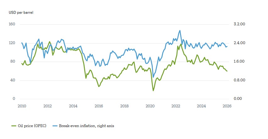 Seguendo questa logica, anche la sola prospettiva di una rinnovata offerta può raffreddare i prezzi del greggio, facendo scendere le aspettative di inflazione break-even a 10 anni negli Stati Uniti. Poco importa che non sia ancora chiaro chi, a quali costi e in quali tempi possa risollevare il settore degli idrocarburi venezuelano. Come evidenzia il grafico, la sensibilità non è fissa: molto dipende dalle aspettative degli investitori sulla capacità delle banche centrali di ancorare l’inflazione. In tal caso, le autorità monetarie potrebbero “guardare oltre” gli shock petroliferi, a meno che non siano estremi. È per questo che i policymaker si concentrano sull’inflazione core, che esclude le componenti più volatili come energia e alimentari.