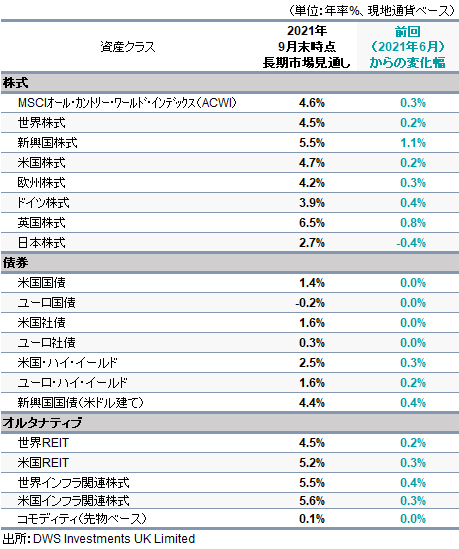 当レポートでは、2021年9月末基準での、主要資産クラスのDWS長期市場見通しを示します。