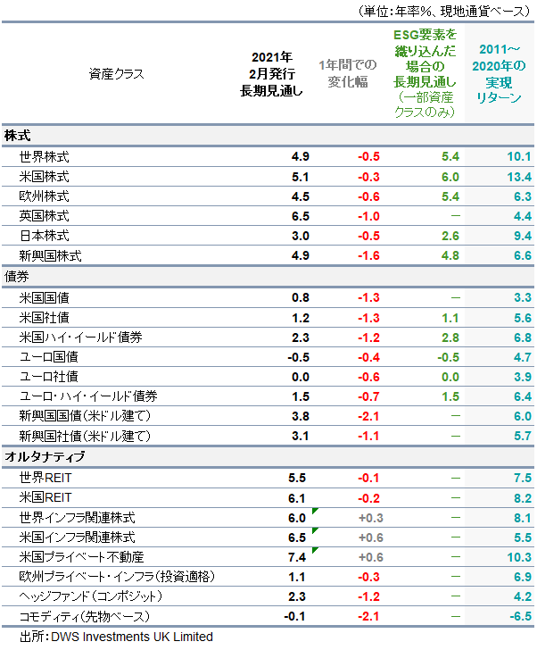 各資産クラスの期待リターンが控え目となっている環境下では、戦略的アセット・アロケーションの重要性が増すため、ポートフォリオの構築にあたっては厳格かつ規律あるアプローチが求められます。このような中、ESG投資は、過去1年だけでも、資産市場のほぼすべてのセグメントにおいて劇的な普及を実現しており、今後もESGは投資家のポートフォリオにおける構成要素となると見ています。そのため、今回初めて、主要地域のESG指数をDWS長期見通しの対象に含めました。