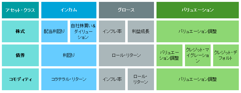 当社は、全ての資産クラスについて、ビルディング・ブロック・アプローチに基づく期待リターンを算出しています。同手法は分析に一貫性と透明性をもたらし、投資家が期待リターンの構成要素をより深く理解する上で有効と考えています。具体的には、期待リターンを、「インカム」、「グロース」、「バリュエーション」の三つの基本要素に分けて、それぞれにサブ要素を設定しています。例えば、伝統的な資産クラス(株式、債券、コモディティ)の基本要素とサブ要素は以下の通りです。