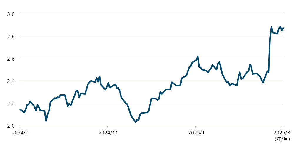 - 3月6日に欧州中央銀行(ECB)は連続6回目となる政策金利の引き下げを実施し、預金金利は2.75%から現在は2.50%になっている。ユーロ圏の経済成長上振れとインフレ率低下の遅れの可能性から、追加利下げの余地は狭まる可能性がある。